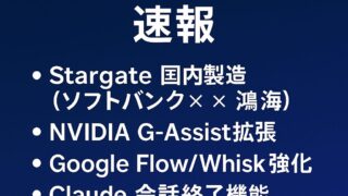 2025年8月18日のAIニュースを実務目線で解説。ソフトバンク×鴻海がStargate計画で米オハイオにAI機器製造拠点、NVIDIAがPC向けG-Assistを拡張、GoogleがFlow/Whiskを強化、Claudeの会話終了機能やROI現実直視の最新動向も紹介。