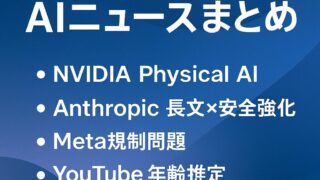 2025年8月11日〜17日のAIニュースを実務目線で解説。NVIDIAがPhysical AIモデルを発表、Anthropicが100万トークン対応&会話終了機能を公開、Metaの未成年チャット問題やYouTubeの年齢推定導入、最新AIアプリや安全利用Tipsまで網羅。