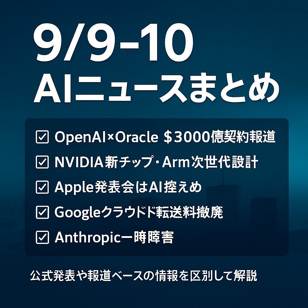 2025年9月9日と10日のAIニュースは、「計算資源の長期争奪」「端末AIの強化」「クラウド移行コスト低下」「常時リッスンアプリの登場とガバナンス」がテーマでした。