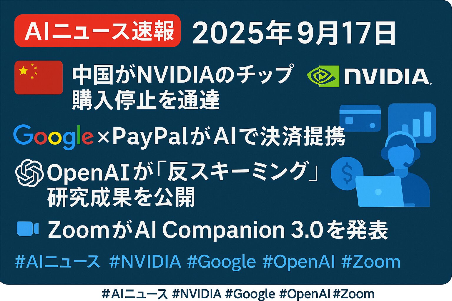 特に「中国によるNVIDIAチップ調達停止」「Google×PayPal提携」「OpenAIの反スキーミング研究」「Zoom AI Companion 3.0」「AMDの市場予測」が注目ポイントです。