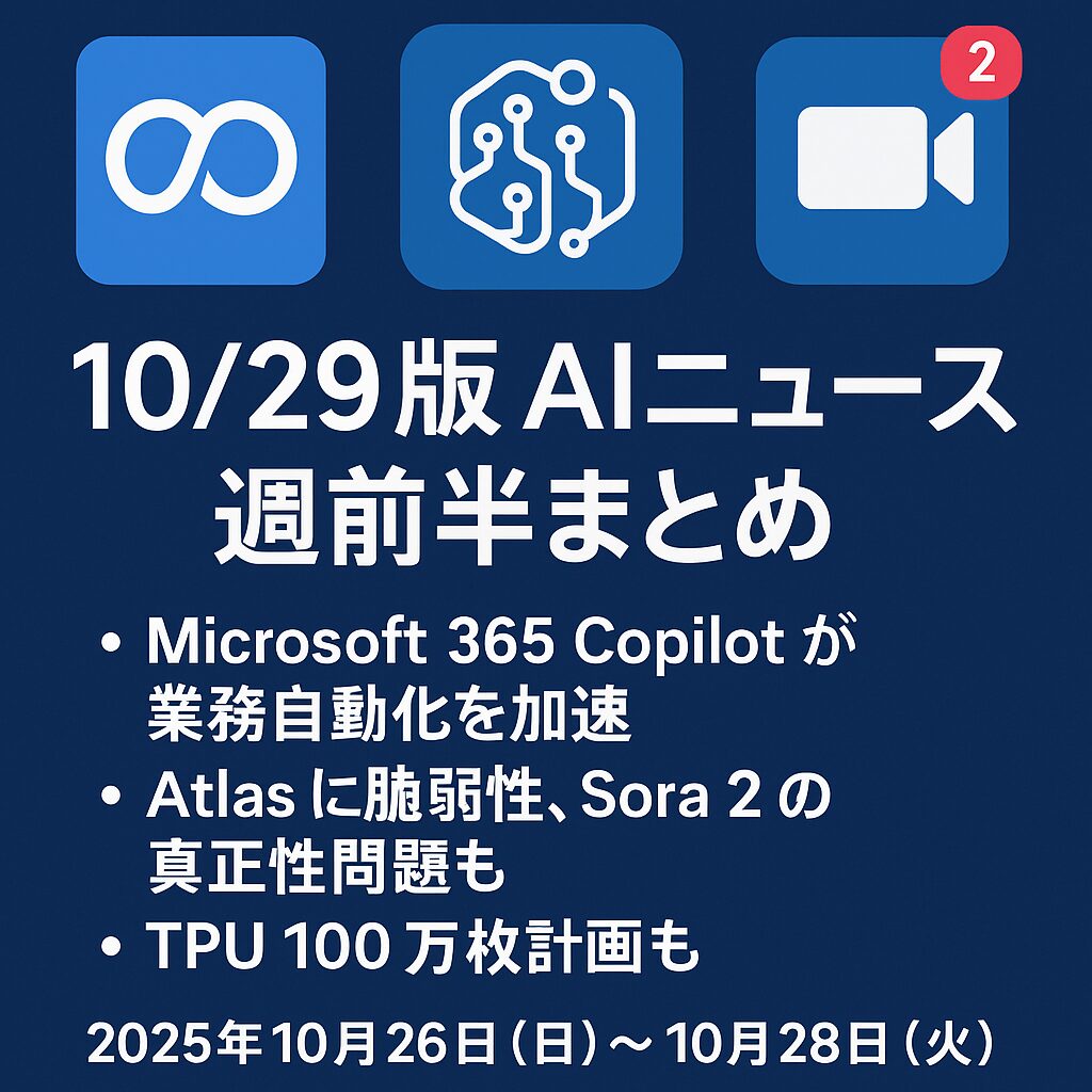 一方、OpenAI「ChatGPT Atlas」の脆弱性、Sora 2の真正性ラベル問題など、安全と信頼を問うニュースも目立ちました。