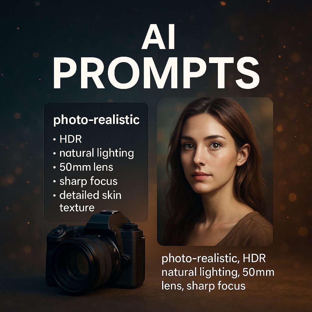 写真再現用構文例:masterpiece, photo-realistic, HDR, natural lighting, 50mm lens, sharp focus, detailed skin texture