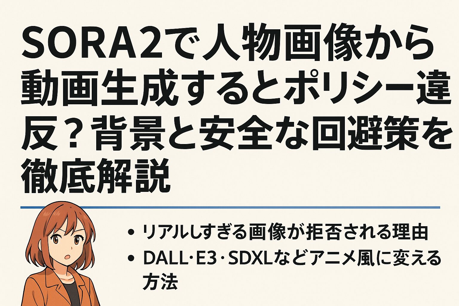 この記事では、SORA2のImage-to-Video機能で人物画像がポリシー違反と判定される背景と、安全かつ合法的に利用するための具体的な回避策を紹介します。